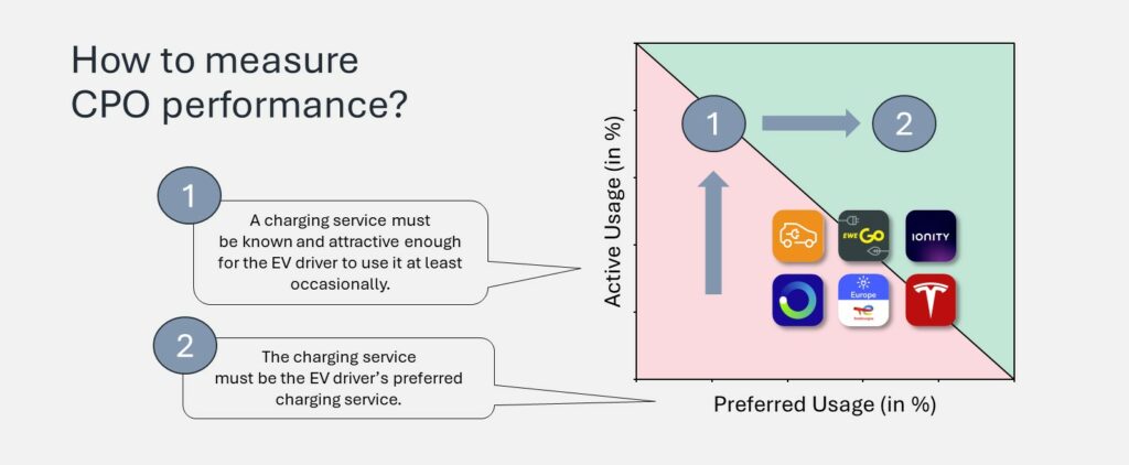 - Preferred Use: Wird ein Ladeangebot genutzt, muss er so überzeugen, dass EV-Fahrende ihn bevorzugt nutzen. In unseren Charging Services Studien erheben wir, welchen der aktiv genutzten Dienste sie bevorzugen und wann die anderen zum Einsatz kommen.