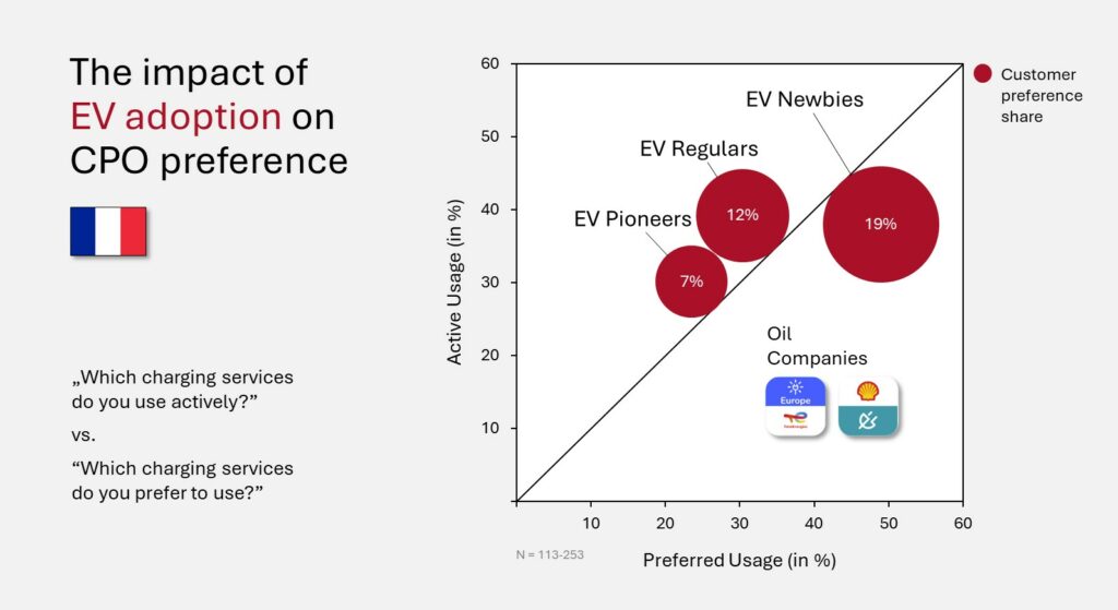 Frankreich gehört heute zu den Ländern mit der dichtesten öffentlichen Ladeinfrastruktur in Europa. Über 100.000 öffentliche Ladepunkte stehen zur Verfügung, und nahezu alle Autobahnraststätten sind inzwischen mit Ladeangeboten ausgestattet. Die ursprüngliche Knappheitsfrage ist damit weitgehend gelöst. Kunden können also wählen und genau diese Wahlmöglichkeiten spiegeln sich in unseren KPIs für Active und Preferred Use wider.