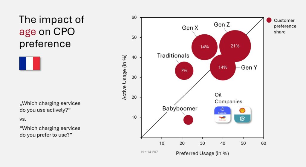 Die Veränderung der Marktstrukturen zeigt sich exemplarisch und gleichzeitig eindrucksvoll beim Einfluss des Alters auf die Performance von Ölkonzernen. Während nur 2% der Babyboomer diese Anbieter präferieren, liegt der Anteil bei der Gen Z bei beeindruckenden 21%. Je jünger die EV-Fahrenden, desto stärker bevorzugen sie bekannte Marken der Mineralölanbieter, ein Zusammenhang, der für gezielte Marketing-Strategien genutzt werden kann.