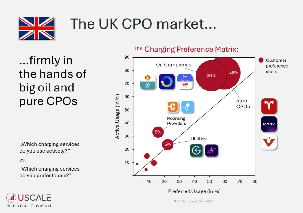 The early market development still shapes the UK today. With their focus on high‑power charging along major corridors, pure CPOs such as Tesla, InstaVolt and IONITY occupy pole position: 78% of public‑charging EV drivers have a contract with a CPO, and 59% of them prefer their CPO which leads to a customer preference share of 46%.